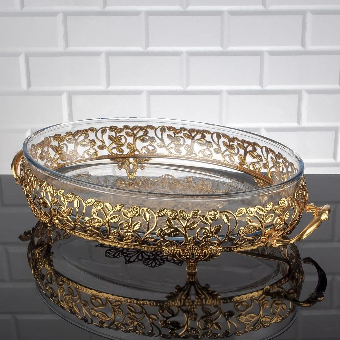 صحن تقديم زجاج Roza بيضوي حجم كبير – ذهبي شحن سريع لأنحاء العالم من قصر الباشا خلال 3 الى 5 أيام اطلب الآن تصلك لباب المنزل