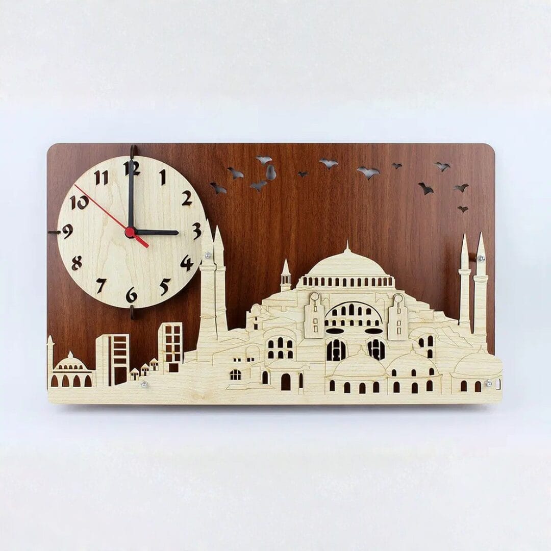ساعة جدارية خشبية برسمة جامع آيا صوفيا التاريخي والطيور المحلقة فوقه