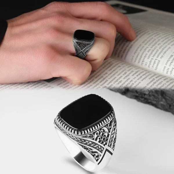 استمتع بأناقة لا مثيل لها مع خاتمنا الرجالي الفاخر، مصنوع من فضة الإسترليني عيار 925 ومزين بحجر العقيق الأسود الأنيق.