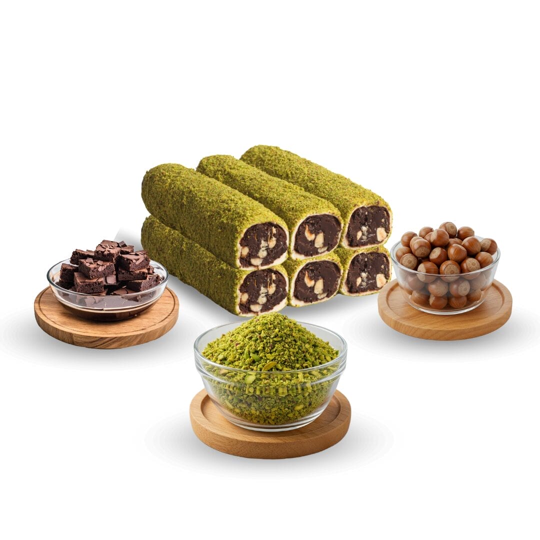 تمتع بتجربة فريدة مع حلقوم تركي ملفوف مزين بالفستق الحلبي المجروش محشو بالبندق والكريمة، تجربة فاخرة بنكهة لا تُقاوم.