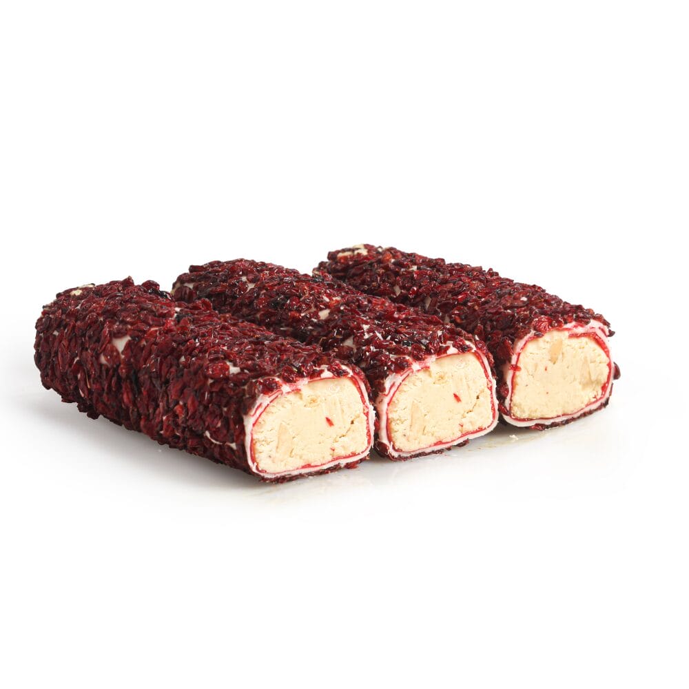 سكر، نشا الذرة، ماء، بندق، زريش العنب، كريمة البندق، نكهة الرمان والفانيليا، مستخلص نبات الشوغان، منظم الحموضة، ملون غذائي.