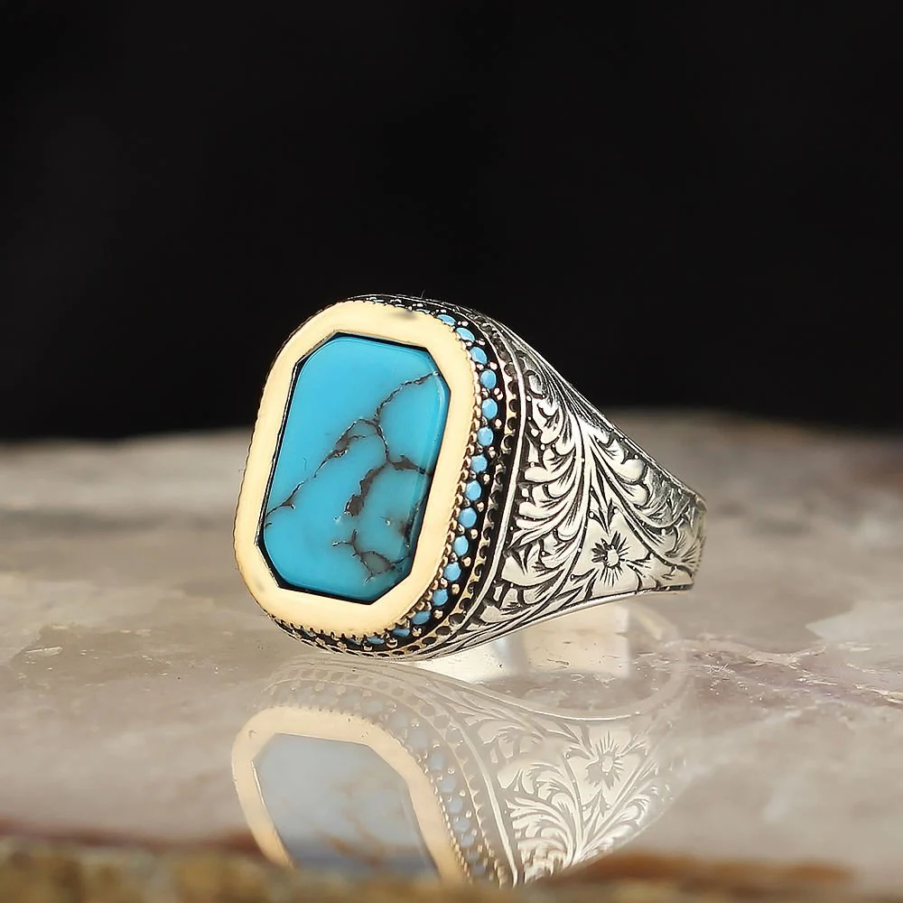 دع خاتمنا الرجالي المزخرف بحجر الفيروز يأسر قلوب الجميع. يتميز هذا الحجر بلونه الزمردي الساحر ولمعانه المذهل، مما يضفي لمسة ساحرة وجاذبية لا تُقاوم على يدك. انغمس في بحر الأناقة وتألّق بروعة الفيروز في كل مناسبة تحضرها.
