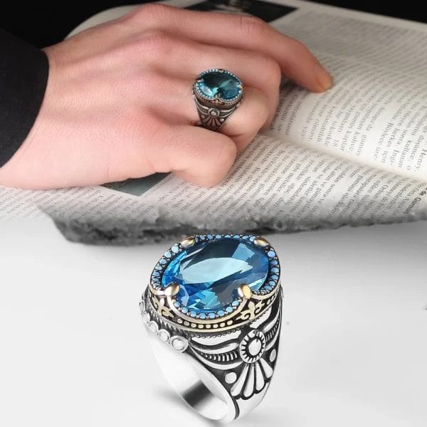 مميزات خاتم رجالي من الفضة الإسترليني بحجر التوباز الأزرق