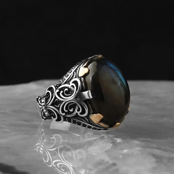 - جاذبية حجر اللابرادوريت: مزين بحجر اللابرادوريت الساحر، الذي يتميز بتدرجاته اللونية المتغيرة والعميقة.
