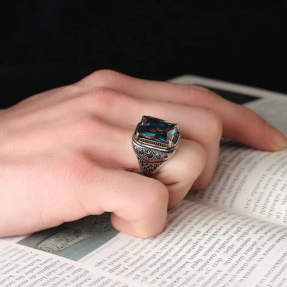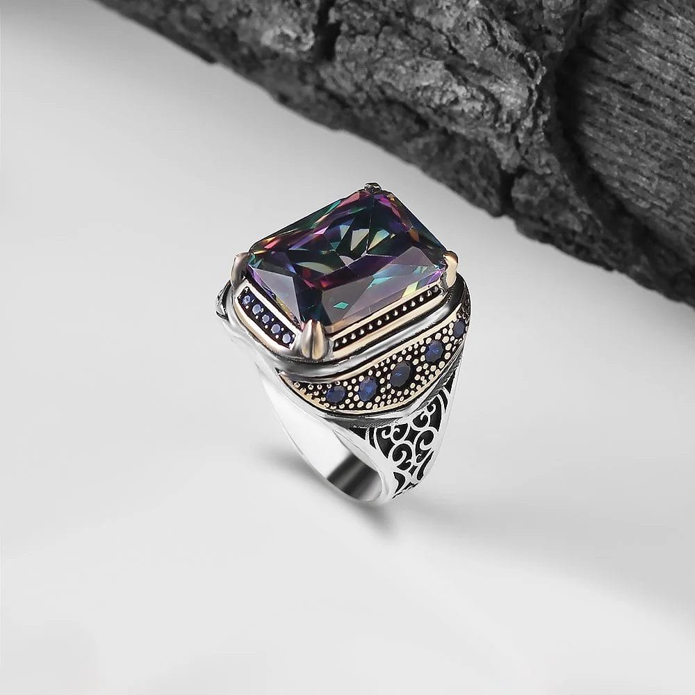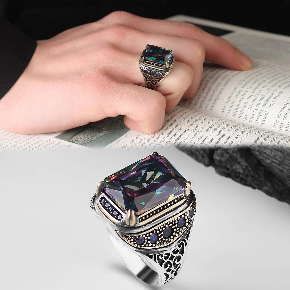 استعد للسحر والإبهار مع هذا الخاتم الرجالي الأنيق. يتميز بحجر التوباز الصوفي الذي يتلألأ ببريقه الخلاب ويضفي لمسة من الأناقة والرقي إلى إطلالتك. سيتألق هذا الحجر بألوانه المتعددة عند تعرضه للضوء، مما يجعلك محط الأنظار في أي مناسبة.