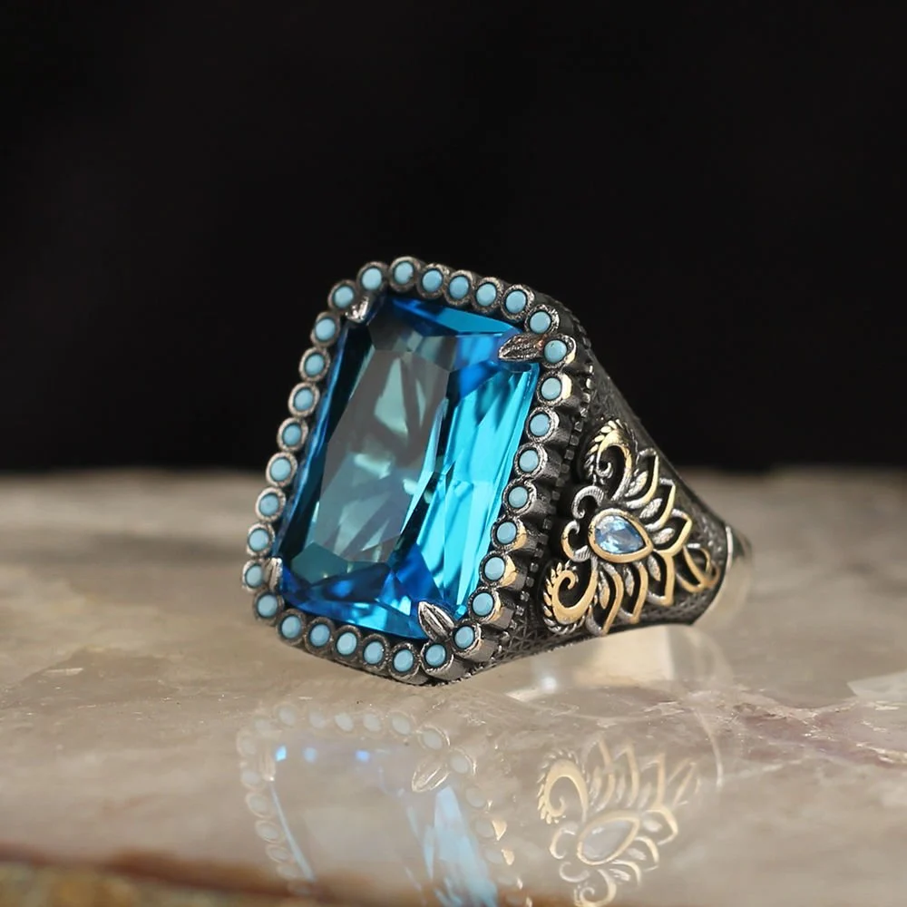 استعد لاستكشاف عالم الأناقة والتميز مع خاتم رجالي فضة عيار 925 بحجر الزركون الأزرق. تصميم رائع يجمع بين جمال الفضة النقية وبريق حجر الزركون الأزرق الساحر، ليمنحك إطلالة فريدة وساحرة تلفت الأنظار.