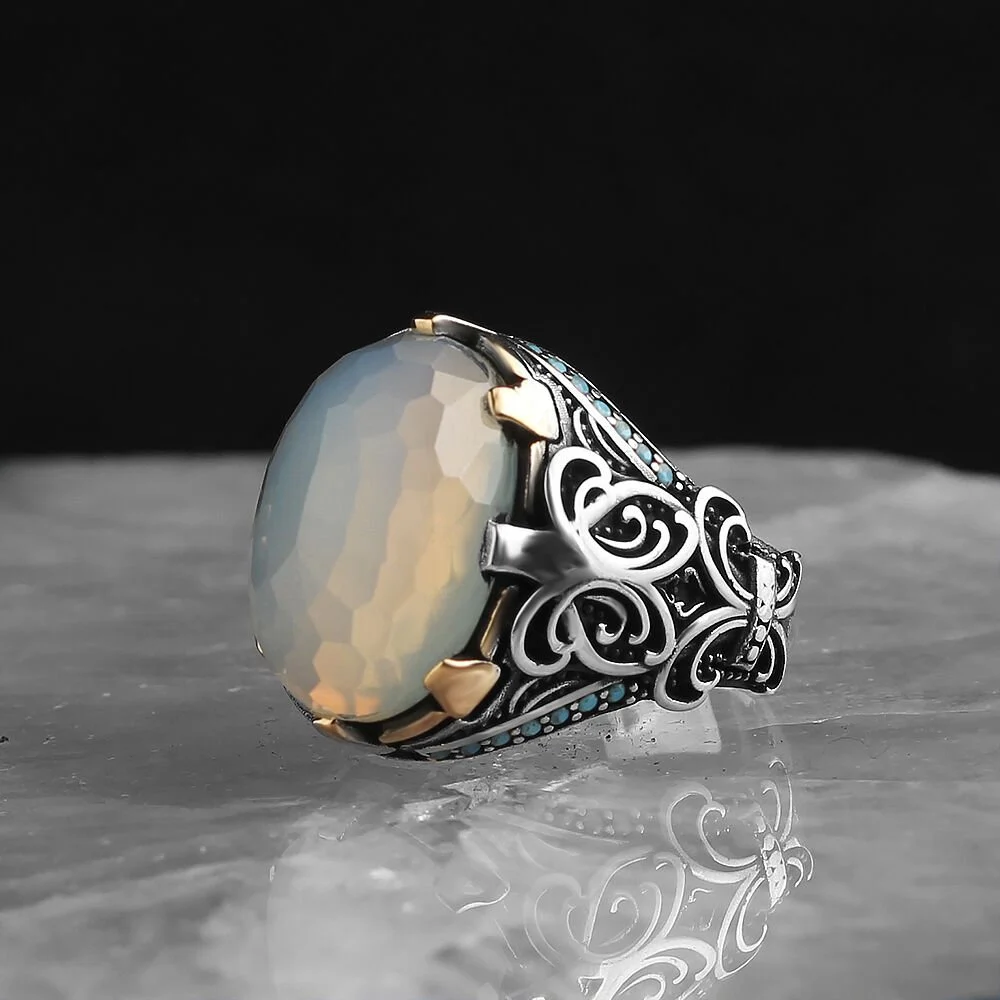 استعد للاستمتاع بسحر القمر على يديك مع خاتم رجالي فضة عيار 925 بحجر القمر. تصميم فريد يجمع بين جمال الفضة عالية الجودة وبهاء حجر القمر الساحر.