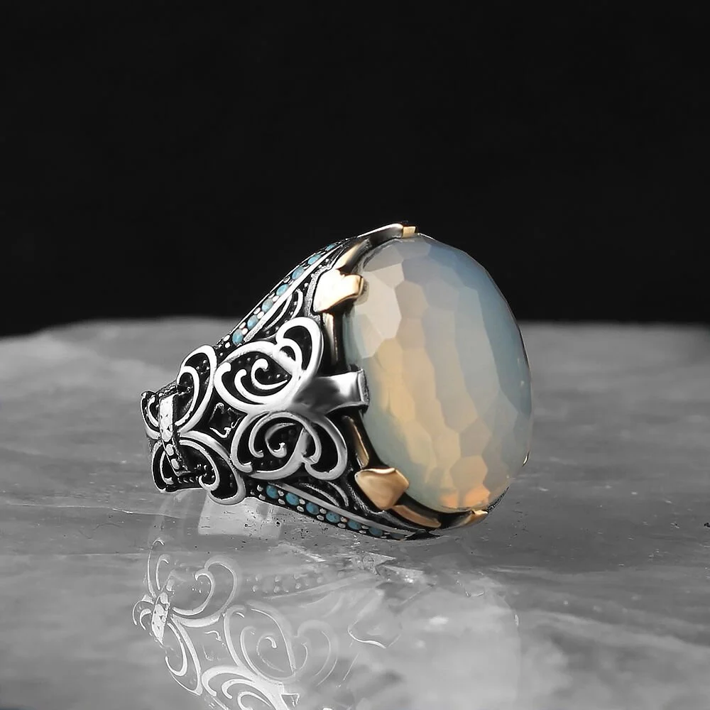 استمتع بسحر القمر المتلألئ على يديك مع حجر القمر الرائع. يتميز هذا الحجر بألوانه الناعمة ولمعانه الساحر، مما يجعله يشع بسحر السماء ويضفي لمسة ساحرة ورومانسية على الخاتم. استعد للتألق وتجذب الأنظار بسحر القمر الساحر.