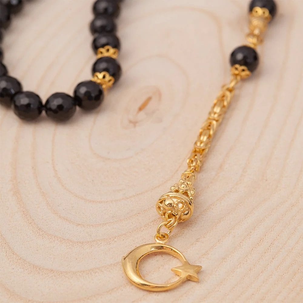 سبحة فاخرة مصنوعة من حجر الأونيكس الأسود الأنيق، مطلية بالذهب الخالص لتضفي لمسة من الرونق والفخامة. تتميز هذه السبحة بحبوبها المتقنة الصنع بقياس 8*8 ملم، ما يجعلها مثالية للإمساك والتسبيح. بطول إجمالي يبلغ 26 سم و16 سم من الأمام، توفر هذه السبحة تجربة مريحة وملائمة لليد.