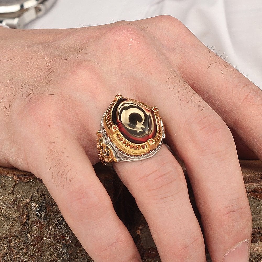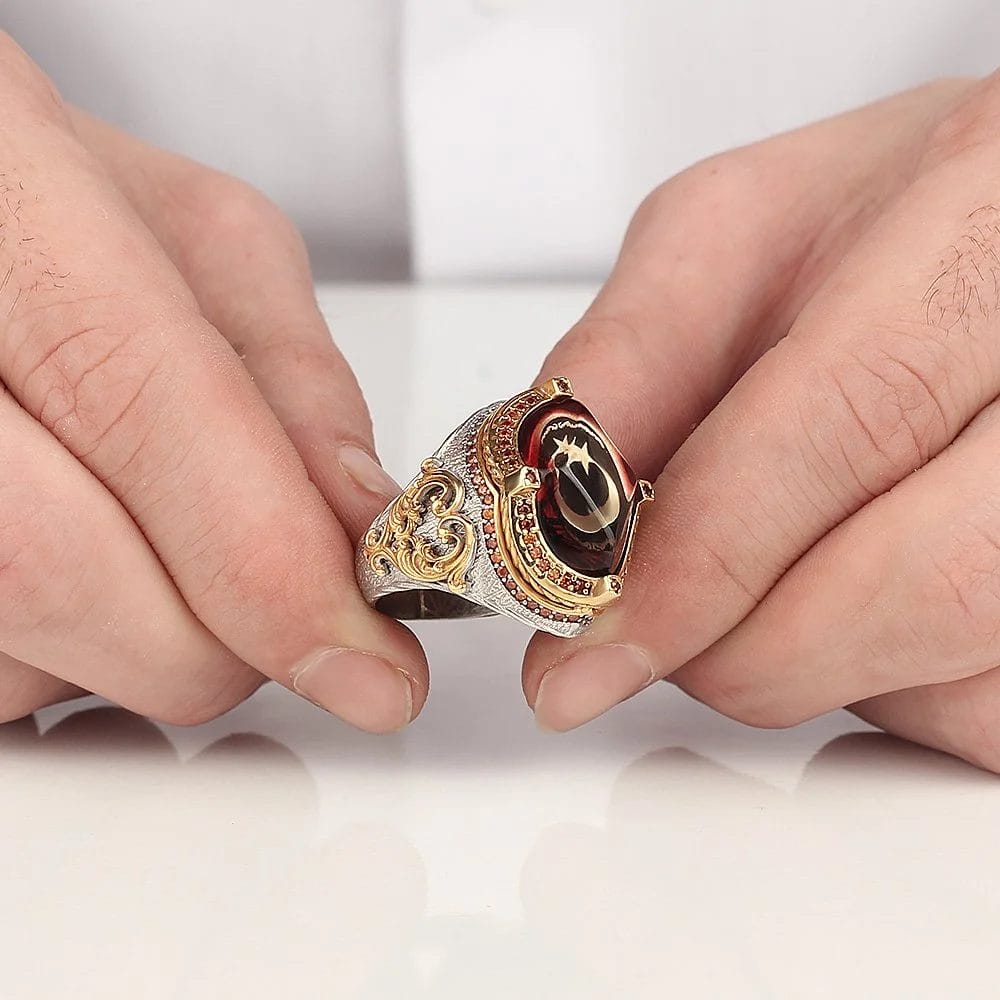 مميزات خاتم رجالي بحجر الهلال والنجمة والعنبر مطلي بالروديوم