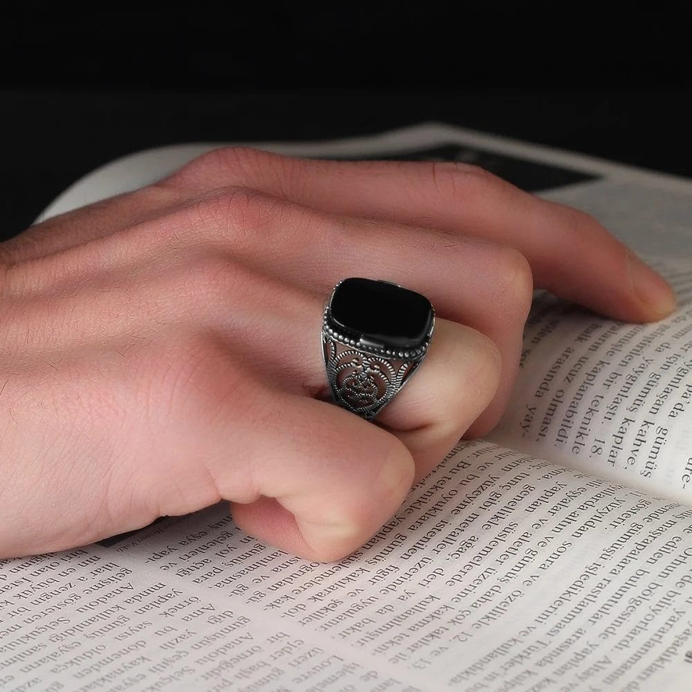 يتميز هذا الخاتم بحجر العقيق الأسود الساحر، الذي يضيف لمسة من الغموض والقوة إلى إطلالتك. بفضل لونه العميق وبريقه الرائع، ستتألق بأناقة فريدة وستجذب الأنظار في كل مناسبة.