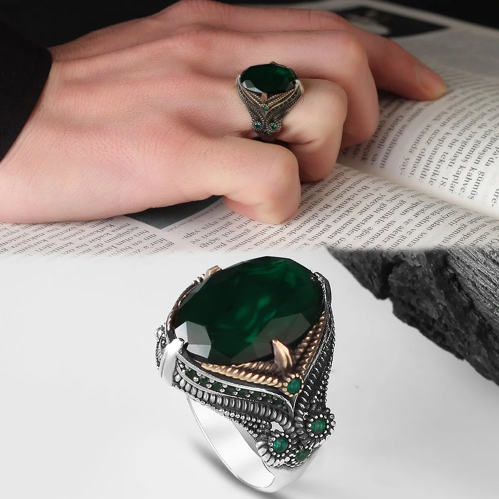 خاتمنا الرجالي من فضة عيار 925 مع حجر الزركون الزيتي يمثل قطعة فنية تجمع بين الجمال والرقي. ارتديه لتضيف لمسة من الأناقة والتفرد إلى مظهرك اليومي.