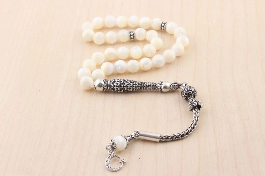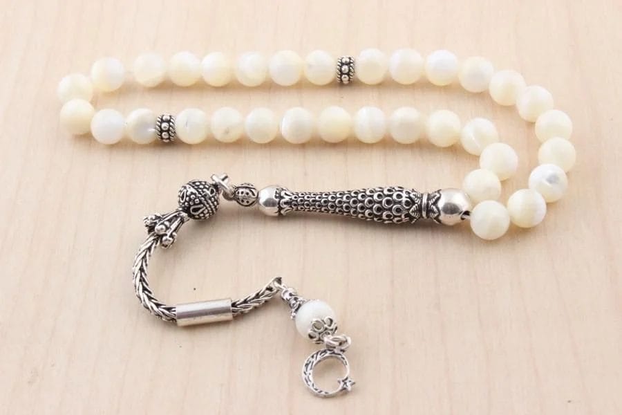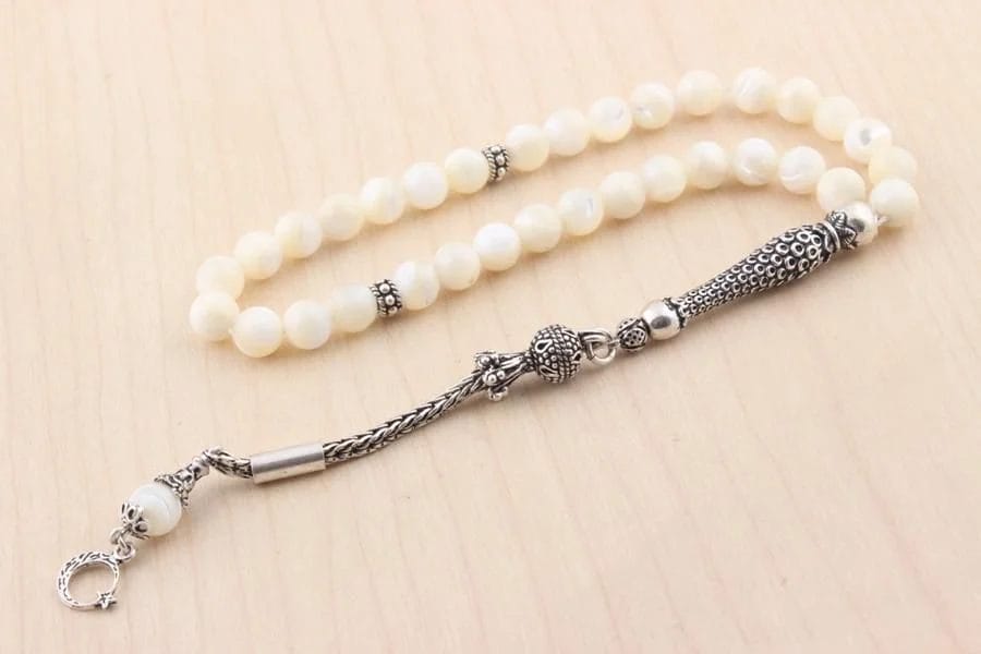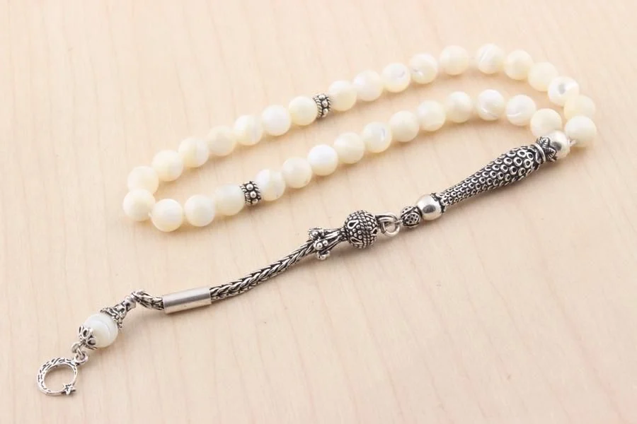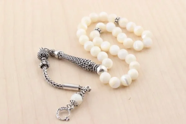 - تصميم فاخر وأنيق: استمتع بالجمال الخلاب لسبحة صلاة مصنوعة من عرق اللؤلؤ النقي، مكملة بشرابات من الفضة الإسترليني عيار 925. تصميم يجمع بين الأناقة الكلاسيكية ولمسة عصرية.