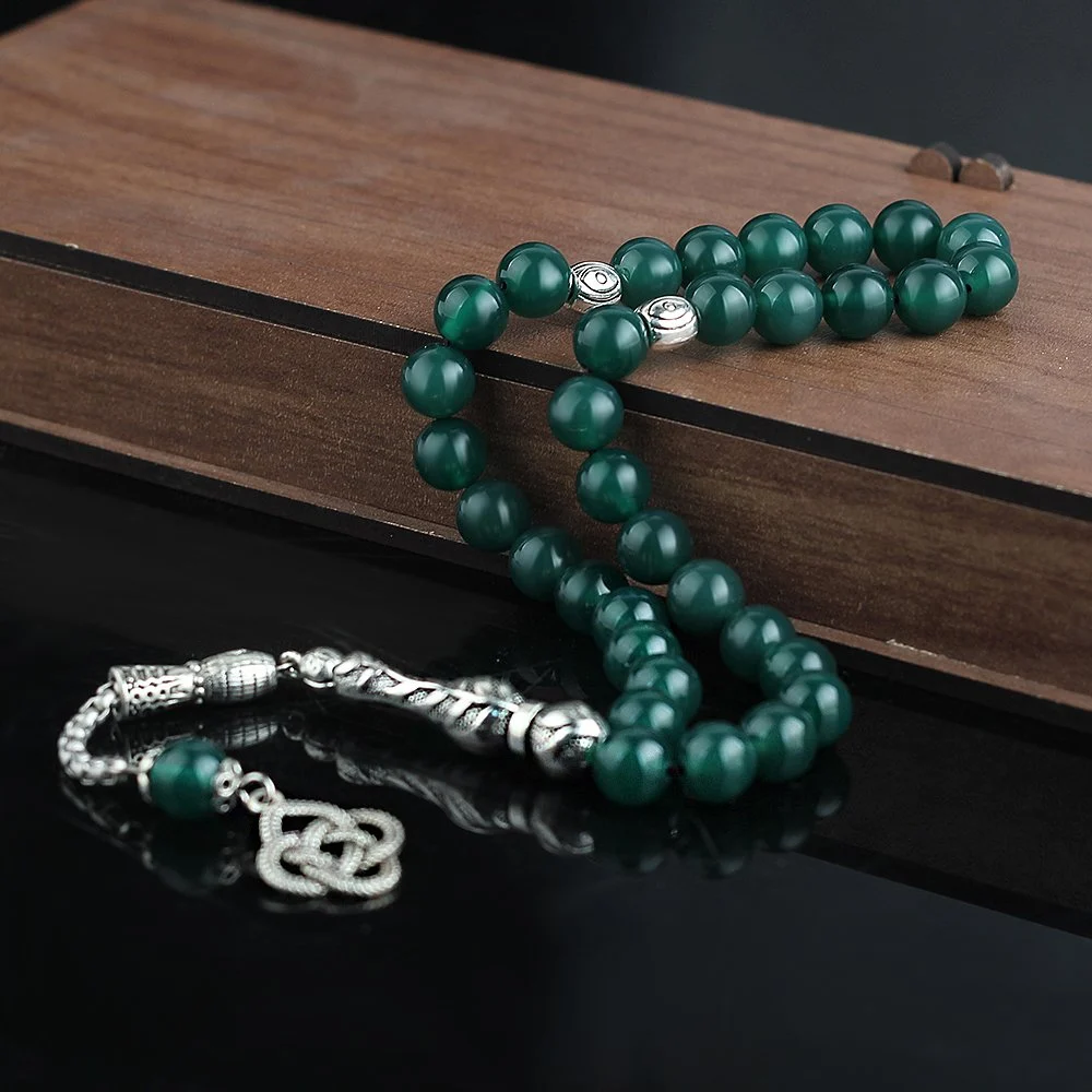 - حجر العقيق الأخضر: يتميز بلونه الجذاب والأخضر الغامق، مما يجعل هذه السبحة قطعة استثنائية تزين إطلالتك.