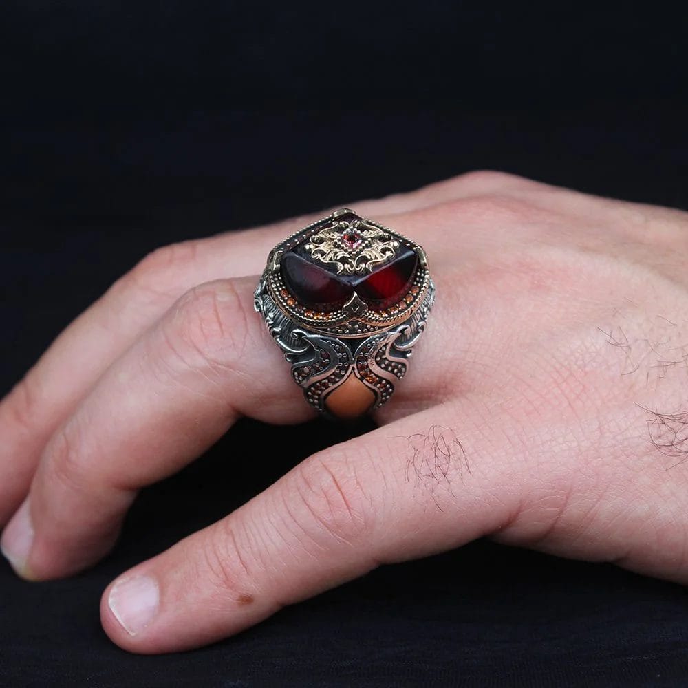 استعد للتألق بخاتم رجالي فاخر مصنوع من الفضة الإسترليني عيار 925، مرصع بحجر العنبر الأحمر الساحر. تصميم راقٍ وأنيق يلفت الأنظار، مع جودة استثنائية وتفصيل دقيق. هدية مثالية للرجال الذين يعشقون الأناقة. اجذب الأنظار وتألق بأسلوب لا يُضاهى مع هذا الخاتم الفريد.